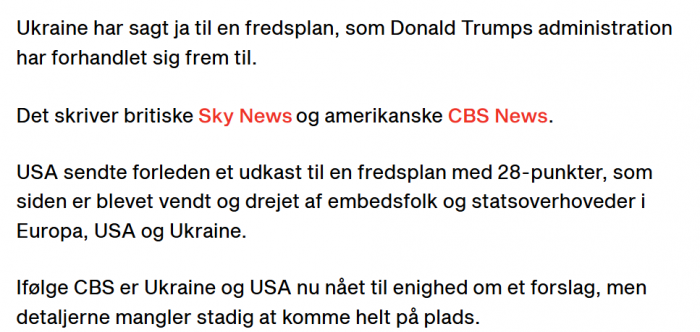 CykelNille skrev:Hvilke punkter synes du divergerer? Det kunne ligne, at hun har fået dem fra Politikens artikel her: https://politiken.dk/internationalt/art10633633/Se-alle-28-punkter-Her-er-Trumps-fredsplan, hvor hun så har suppleret noget til.
