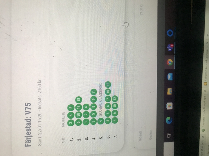 Ja, der var meget, der ikke gik, som jeg havde troet. Nr. 6 skulle klart have været til spids uden de store anstrengelser, nu den havde fået fint spor - og dermed havde en fin chance for ikke at galopere. Den holdt sig i trav, men en ubesværet spids blev det ikke til. Det er noget skidt at vi er røget af og nu skal håbe på 6 rigtige. Redigeret af Travkongen d. 22-01-2022 16:57