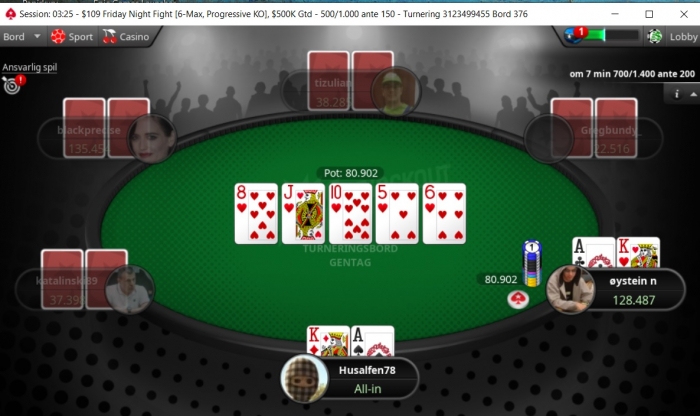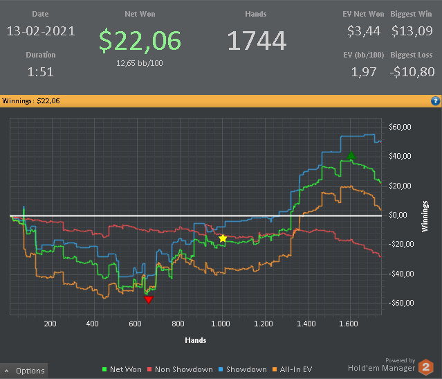 Starter lige ud med at skylle ca 5 buyins i lokummet de første 650 hænder, men jeg fik vendt skuden(med lidt medvind), og ender i et lille plus.