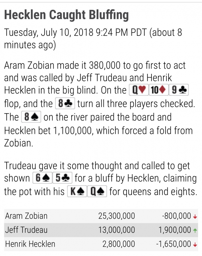 Jeg har set 0 sek. af WSOP. Læste bare på WSOP.com "Nicolas Manion continued his aggression in the very next hand and opened to 1,500,000 first to act". Manion har været aggressiv, og Labat caller blot(vigtig pointe), så synes jeg nu et JJ shove for at samle 20% op er helt okay. Det bør vel være ret standard, når Labat og Manion skal folde så stærke holdings.